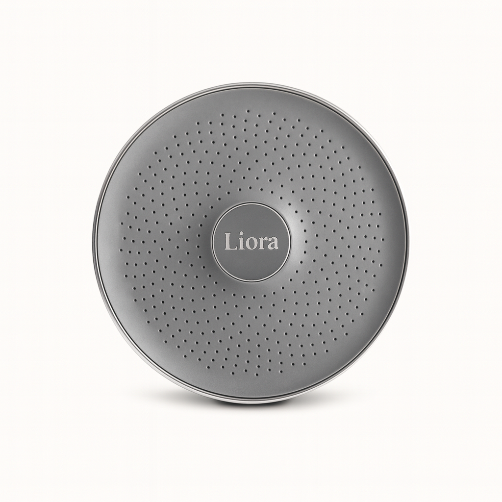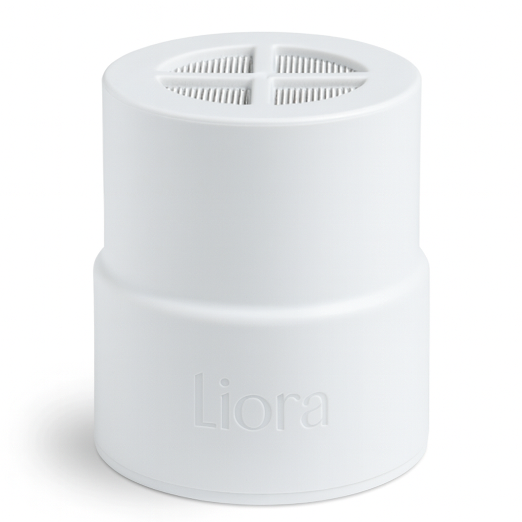 Liora uses a multi-stage filtration system that targets chlorine, heavy metals, and other impurities while preserving beneficial minerals. Inside the filter are activated carbon and KDF (Kinetic Degradation Fluxion) materials that react with contaminants and neutralise them before they reach your skin and hair.